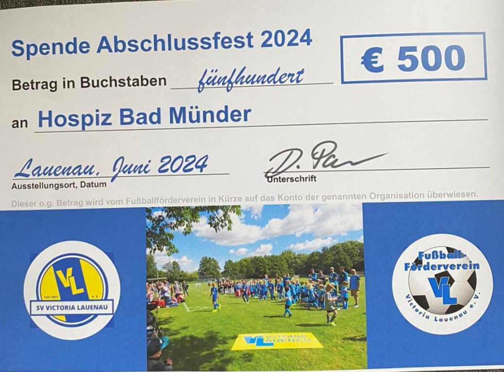 Im Rahmen des Saisonabschlussfests der Fußballabteilung des SV Victoria Lauenau im Juni 2024 wurde nicht nur Fußball gespielt und gefeiert, sondern auch ein bedeutender Beitrag für einen guten Zweck geleistet. Dank der hervorragenden Organisation und dem Engagement eines engagierten Teams konnte ein Teil der Einnahmen, stolze 500 Euro, an das Hospiz Bad Münder gespendet werden.