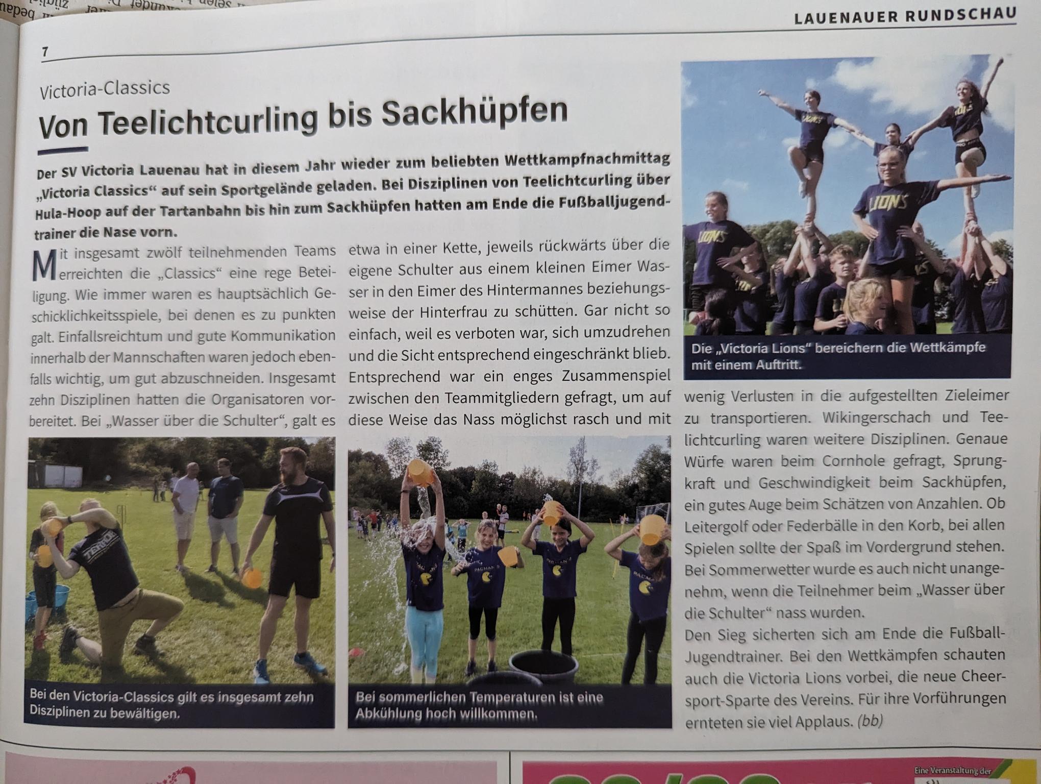Bei bestem Sommerwetter begrüßte Bernd Schwarz zusammen mit Hauptorganisator Michael Cordes die 14 Mannschaften, die mit viel Spaß und Einsatz bei unseren diesjährigen Spielen dabei waren, in der Pause gab es viel Applaus für den 2. Auftritt unserer Cheersportler, den Victoria Lions, danke dafür!