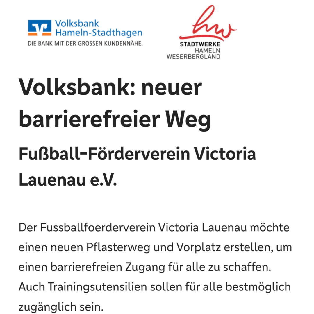 Der Fussballförderverein Victoria Lauenau in Zusammenarbeit mit dem Hauptverein Victoria Lauenau kann nun in 2025 einen neuen Pflasterweg und Vorplatz erstellen, um einen barrierefreien Zugang im Victoria Sportpark Lauenau für alle zu schaffen: Eltern sowie Großeltern, Zuschauer, Trainer, Betreuer, Sportler bei Fussball, Leichtathletik oder Sportabzeichen. Auch Trainingsutensilien sollen für alle bestmöglich zugänglich sein.