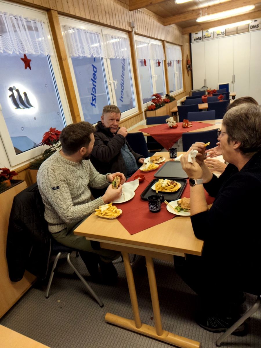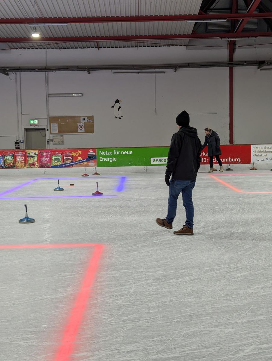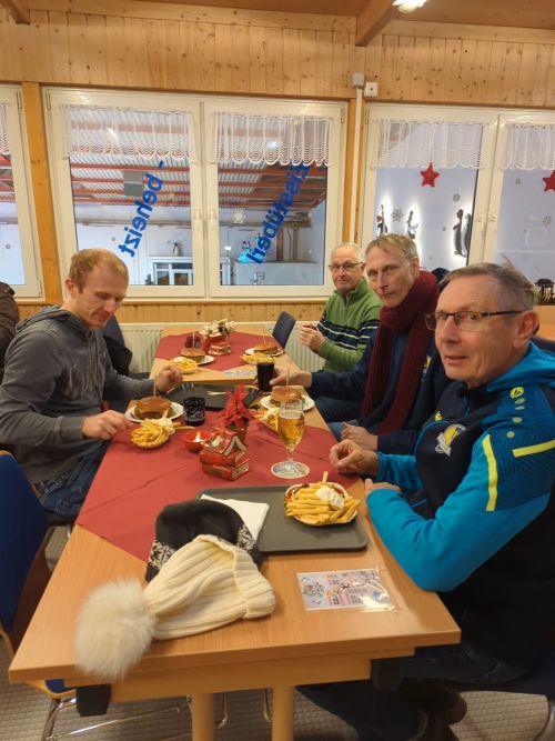 Während einige Teams noch fleißig den Eisstock schwangen und schoben, ging es teamweise zum Burger essen mit vielen guten Gesprächen, neuen Ideen und jeder Menge Lachen. Dies führte dazu, dass sich einige gar nicht mehr aus dem gemütlichen Stübchen über der Schlittschuhausleihe aufs Eis begeben wollten: Da hatten sie aber die Rechnung ohne den bereits angefrosteten Rest auf dem Eis gemacht! Eine Runde musste es dann doch noch sein für alle!