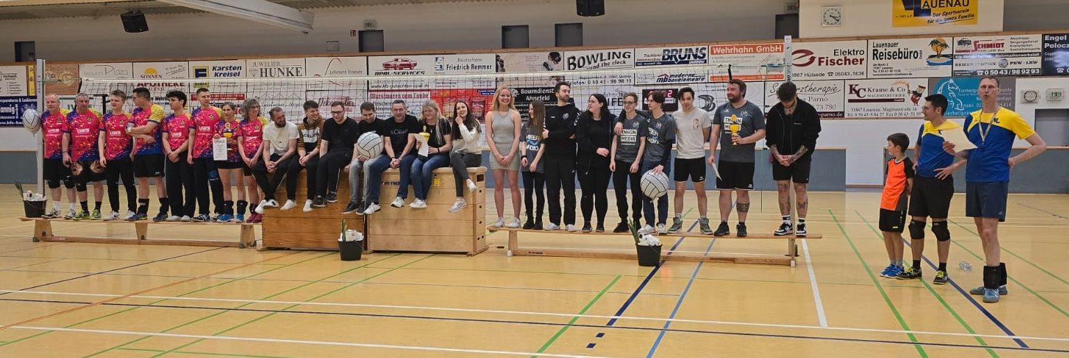 … könnte man den vergangenen Samstag in Anlehnung an Siegfried Lenz‘s Erzählungen übertiteln. Der Tag und die Stunde des 17. Kuddel-Muddel-Mixed-Volleyball-Hobbyturniers war an diesem 6. April 2024 gekommen. Schon der Zeitplan für unser Aufbauteam war sportlich. Ab 08:00 Uhr wurden Netze gespannt, Schiri-Kästen geschoben und Mannschaftsbänke platziert, während auf der Empore auf langen Tischreihen mit Leckerei an Leckerei ein Buffet für die zehn Gastmannschaften (und natürlich auch für uns selbst) entstand. Ab 09:30 Uhr kam mit der Ankunft unserer Gäste mehr Leben in die ehrwürdigen Hallen der Victoria Arena: Altbekannte Namen wie der VfL Bad Nenndorf, der SC Auetal, die „Sunday (K)Nights“ aus Kreuzriehe, der TSV „Basche“ Barsinghausen, der SV Wölpinghausen, die VG Lindhorst, und nach längerer Pause frisch erstarkt „die Frösche“ aus Lohnde! Aufgrund fehlender Mannstärke waren die „Ritter“ des TSV Rauenstein, langjährige Stammteilnehmer aus dem fernen Thüringen, leider nicht dabei. So entstand Raum für neue Teams auf der Einladungsliste: Die SV Butteramt (ehemals der TSV Bokeloh), der TuS Steyerberg und die SG Binnen/Lemke/Wellie aus dem Nienburger Raum, mit denen wir bereits in der Hobbyliga gespielt haben, durften wir als weitere Gäste diesmal bei uns begrüßen. Herzlich willkommen!