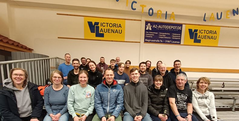 Beim Blick auf das Foto lässt sich kaum ahnen, was für einen Spaß die jeweils zwei Mannschaften aus Kreuzriehe und zwei Hobbyteams des Victoria an diesem Sonntagabend gehabt haben. Die Pritscher und Baggerer des TuS Helsinghausen – Kreuzriehe e.V. (so heißen sie offiziell mit ganzem Namen) ließen sich auf unsere Einladung hin nicht lange bitten. Die Sunday (K)Nights (so nennen sie sich inoffiziell selber) fanden sich ebenso zahlreich wie unsere eigenen Leute in der Victoria Arena ein, so dass einem Jeder-gegen-Jeden-Turnier nach kurzem Einspielen nichts im Wege stand.