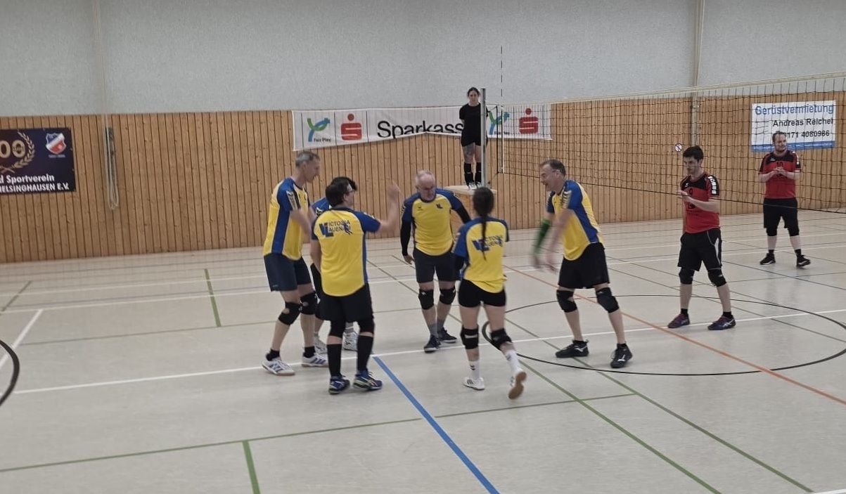 … jedoch so trist ist es dann doch nicht bei den Sunday K(N)ights, die am 16. November 2025 ihr jährliches 4er-Volleyballturnier in heimischer Halle in Kreuzriehe organisierten. Dieses Jahr waren geladen die „Zimtschnecken“ der VG Lindhorst, die Recken des SC Auetal und wir Titelverteidiger aus Lauenau, die pünktlich zum gemeinsamen Warmmachen um 11:00 Uhr bereitstanden. Sympathisch moderierte Gastgeberin Karen Schwarzer von den Sonntagsrittern die gemeinsamen Aufwärmübungen, die so manche gelenkigen Volleyballer an ihre Grenzen trieben.